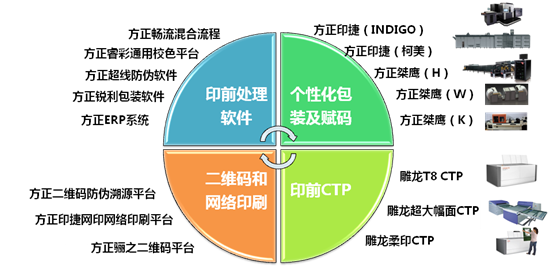 方正包裝印刷解決方案包含了印前處理軟件、個性化包裝及賦碼系統(tǒng)、二維碼和網(wǎng)絡(luò)印刷系統(tǒng)以及印前CTP制版系統(tǒng)四大方面的內(nèi)容: